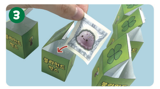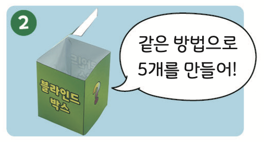 블라인드 박스를 오린 뒤, 노란색 풀칠 칸에 풀칠해 뚜껑이 열린 박스 모양으로 만들어요.