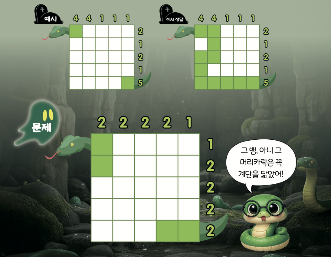 빈칸 바깥의 숫자는 해당 가로줄과 세로줄에서 뱀의 몸이 차지한 칸의 개수예요. 단, 뱀의 몸통은 서로 겹치거나, 붙어 있지 않아야 해요.