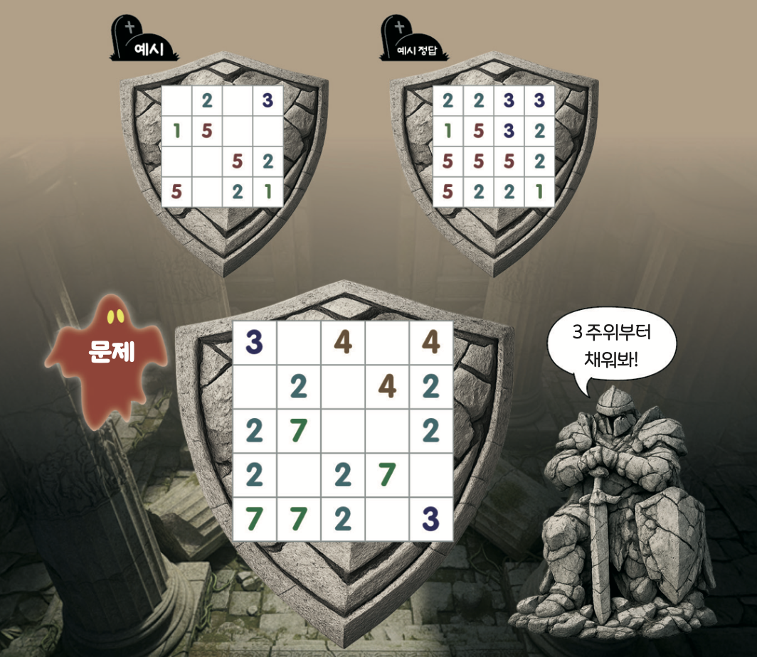 방패 속 빈칸에 숫자를 적어 메두사를 막는 마법을 걸어요. 각 숫자는 같은 숫자끼리, 그 숫자의 개수만큼 이어져요. 대각선으로는 이어지지 않아요.