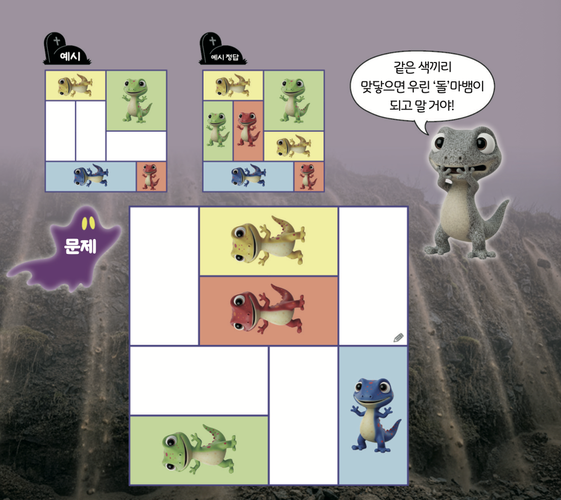 네 가지 색깔 도마뱀들이 메두사의 마법에 걸렸어요. 가로나 세로로 맞닿은 칸에 같은 색깔의 도마뱀이 없도록 도마뱀을 한 마리씩 그리고, 알맞은 색깔로 칠하세요.