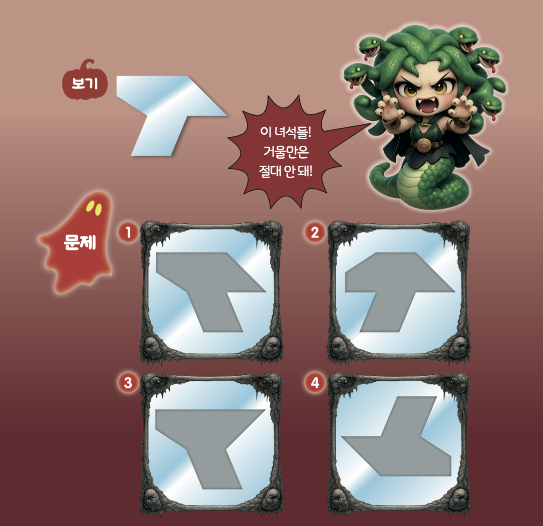 메두사를 거울로 비추면 돌이 돼요. 앗, 그런데 거울을 깨뜨리고 말았어요.