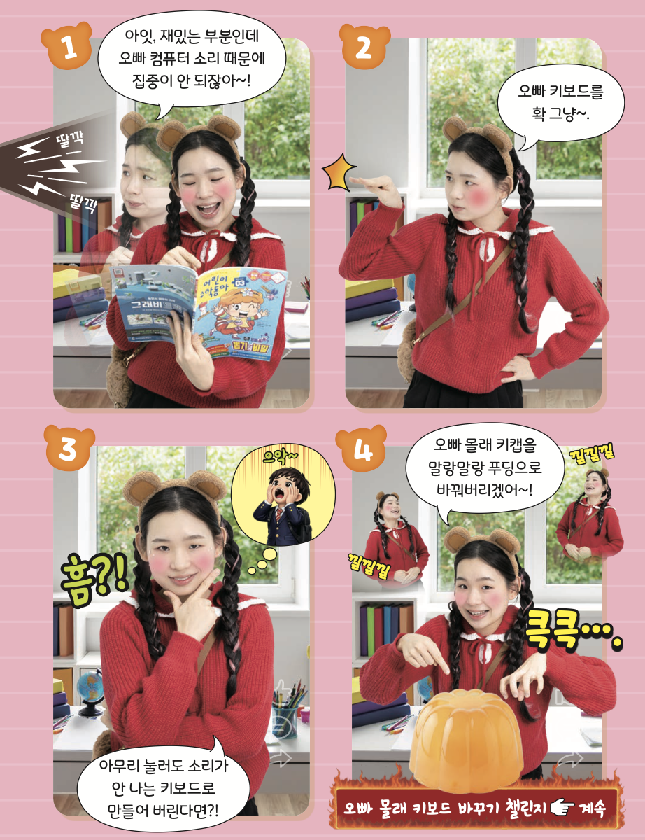 다곰이들~! 딸칵딸칵 키보드 누르기 좋아해? 난 요즘 푹 빠져서 키캡★ 키링도 사고, 키보드 영상도 자주 봐. 나도 한번 만들어 보고 싶었는데…, 마침 오빠 방에서 키보드 소리가 들리잖아?!