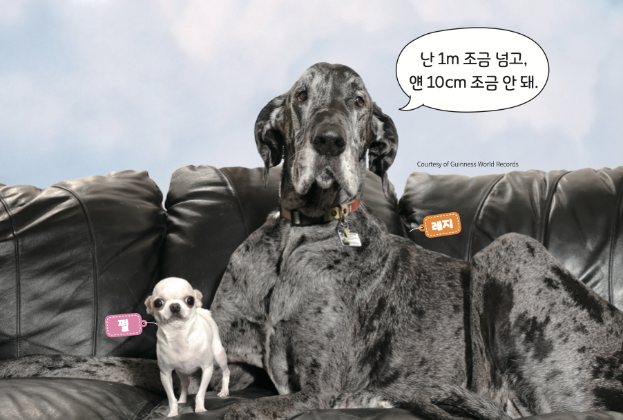 키가 1m(미터)가 넘는 거대한 개 레지와 9.14cm(센티미터)밖에 안 되는 개 펄이 만났어요! 둘의 키 차이는 무려 91cm이지요.