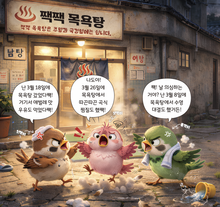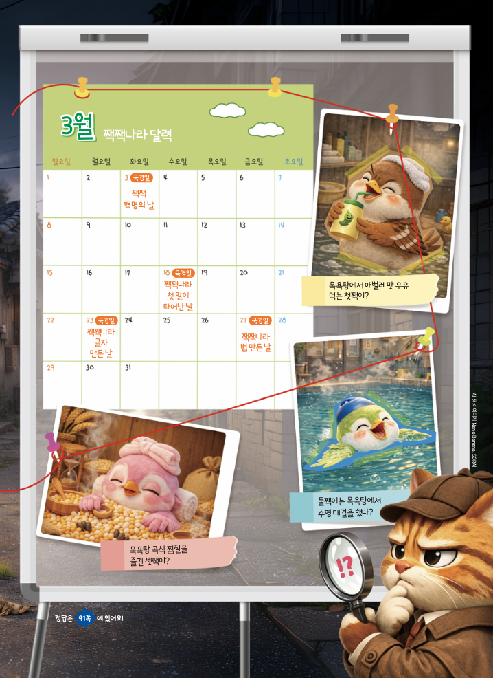 흡! 짹짹이 삼 남매한테서 꼬릿꼬릿한 냄새가 나요. 모두 짹짹 목욕탕을 다녀왔다고 하지만, 한 명만 진실을 말하고 있지요. 짹짹 목욕탕의 간판과 짹짹나라 달력을 잘 보고, 진짜 목욕탕에 갔던 짹짹이를 찾아 O 표시해 주세요.