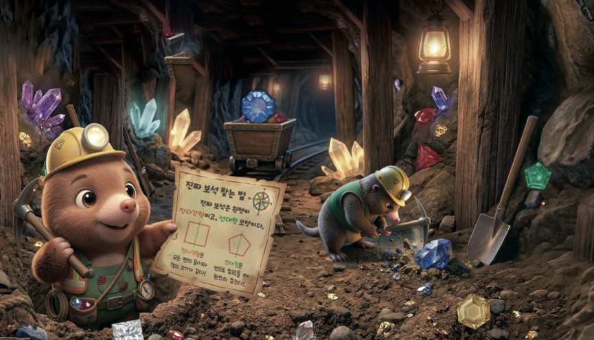 두더지 가문 대대로 내려온 ‘진짜 보석 찾는 법’을 보고, 진짜 보석 5개에 O 표시해 주세요.