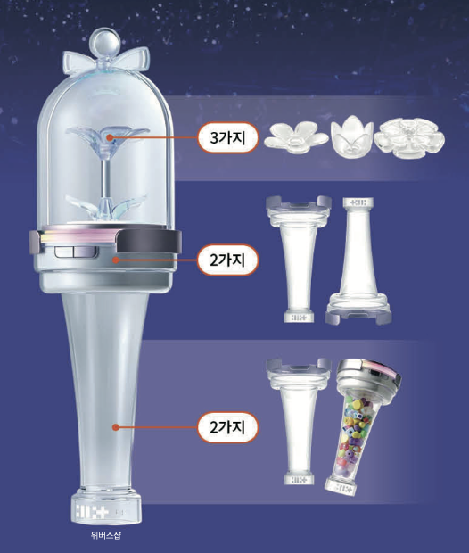 12가지 변신 응원봉! ‘아일릿(ILLIT)’의 ‘글릿봉’은 꽃 장식(3가지), 손잡이 방향(2가지), 파츠를 넣을지 말지(2가지)를 직접 선택할 수 있어요. 3×2×2! 무려 12가지의 꾸미기 방법 중에서 여러분은 어떤 조합이 가장 마음에 드나요?