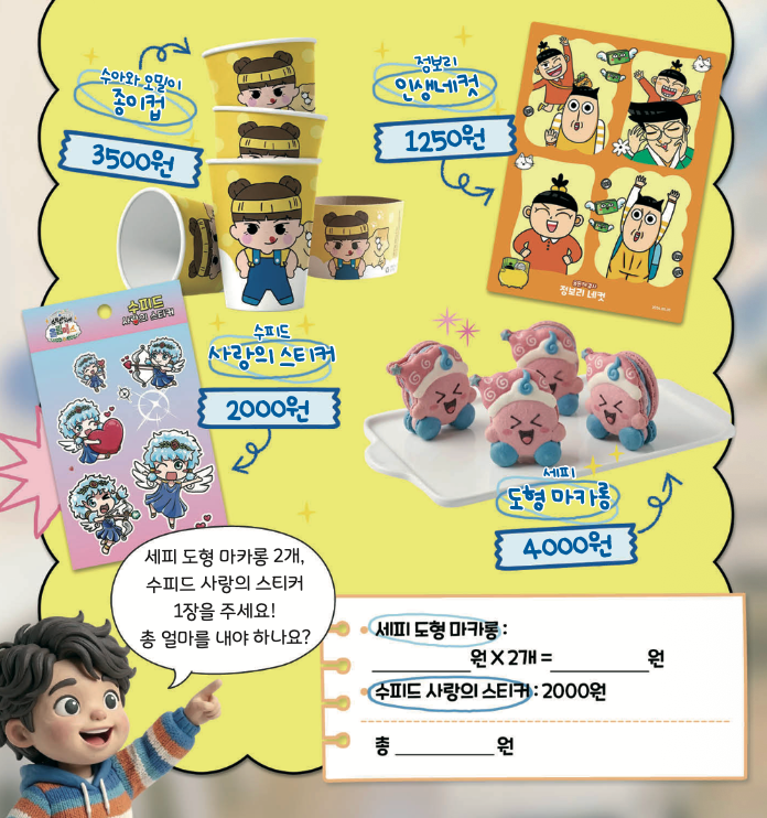 생일카페에 왔다면 ‘생일 특전’을 사야죠! 생일카페에만 파는 한정판 음식과 굿즈거든요. 굿즈의 가격을 보고 얼마를 내야 하는지 계산해 보세요.