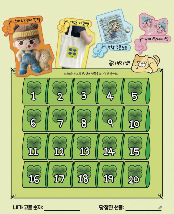 1번에서 20번 중에서 나의 행운의 번호를 골라보세요. 정답 페이지를 펼쳐 어떤 상품이 당첨됐는지 확인해 볼까요?