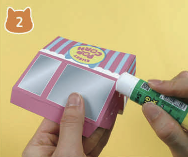 받침대 위에 팝콘 통과 봉투 보관함을 테이프로 붙여요.