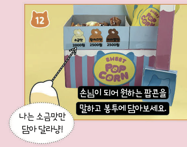 어떤 맛을 찾으시나요? 손님이 원하는 맛만 쑤-욱 퍼서 달콤한 팝콘을 전달해 봐요!