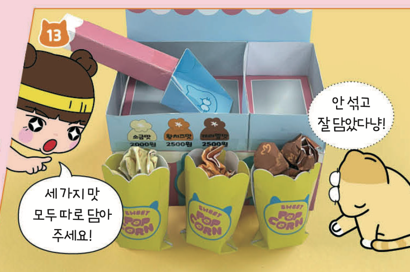 손님이 되어 원하는 팝콘을 말하고 봉투에 담아보세요.