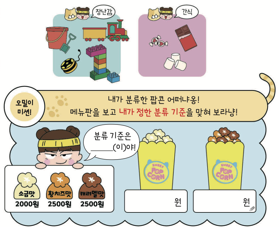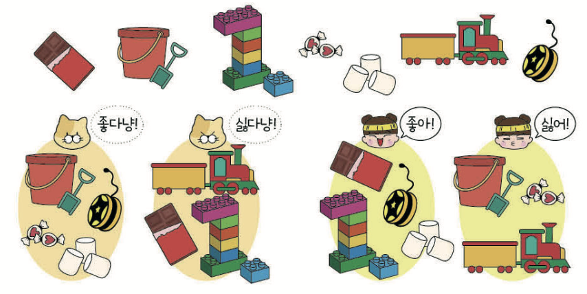 기준이란 누가 보아도 똑같이 나눌 수 있는 특징이지요. 수아와 오밀이가 좋아하는 것과 싫어하는 것이 서로 다른 것처럼 ‘좋다, 싫다’ 또는 ‘예쁘다,