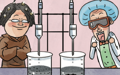 그는 (그림)과 같은 장치를 마련하여 플라스크에 물(${H}_{2}$O) 메탄(${CH}_{4}$) 암모니아(${NH}_{3}$) 및 수소(${H}_{2}$)의 혼합기체(산소는 없음)를 넣은 다음, 전기방전을 시키면서 가열과 냉각을 계속했다. 한주일이 지난 다음, 플라스크 속의 내용물을 분석해 본 결과 몇가지 아미노산과 그밖의 유기물분자가 생겨 있음을 확인했다.