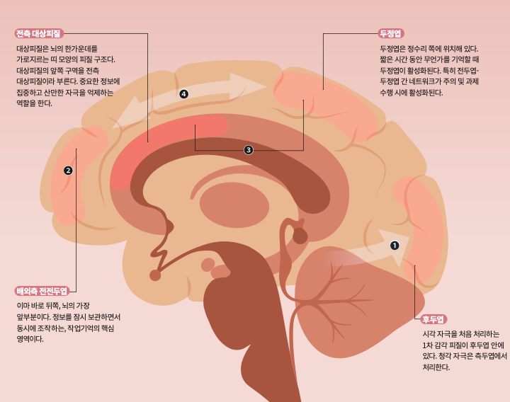 전측 대상피질과 두정엽은 ‘무엇에 집중할지, 무엇을 무시할지’를 선별해 외부 감각 자극에 대한 신경 반응 정도를 조절하는데, 유사한 자극이 반복해서 이어지면 신경 자원이 과도하게 소모돼 선별 및 억제 기능이 약화된다.