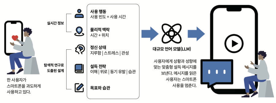 이에 연구팀은 대규모언어모델(LLM)을 활용한 마인드시프트 시스템을 개발했다. 스마트폰에서 앱 형태로 작동할 수 있다. 마인드시프트는 사용자가 특정 앱에 접속할 때 접속한 시간, 장소, 사용 패턴과 사용자의 자기 보고적 심리 상태를 종합해 맞춤형 메시지를 생성한다. 메시지는 총 4가지 유형으로 나뉜다. 감정을 공감하며 수용하는 ‘이해’, 불안과 지루함을 완화할 수 있는 ‘위로’, 개인의 목표를 떠올리게 하는 ‘환기’, 다른 활동을 제안하는 ‘습관 형성’이다.