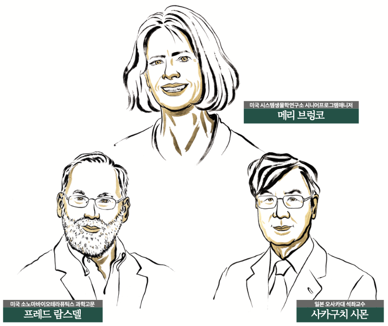 그런데, 중추관용으로도 팀킬 면역세포를 걸러내지 못한다면요? 온몸으로 퍼진 면역세포가 팀킬을 저지르기 못하도록 막는 또 다른 면역관용 반응이 바로 2025년 노벨 생리의학상 수상의 영예를 안은 ‘말초관용(peripheral tolerance)’입니다. 신체의 말초 부위에서 일어나는 면역관용 반응이란 뜻이죠. 말초관용을 밝혀 노벨상을 탄 연구자는 메리 브렁코 미국 시스템생물학연구소 시니어프로그램매니저, 프레드 람스델 미국 소노마바이오테라퓨틱스 과학고문, 그리고 사카구치 시몬 일본 오사카대 석좌교수입니다.