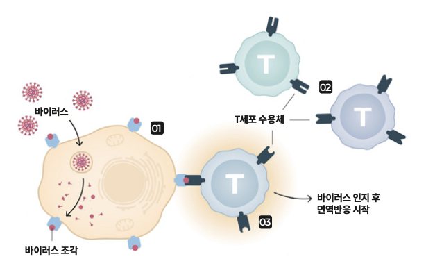 03. 만약 T세포 수용체와 바이러스 조각이 결합하면, T세포가 활성화되며 면역반응을 시작한다. 면역반응에는 다른 면역세포를 불러 모으거나 감염된 세포를 파괴하는 등의 반응이 포함된다.