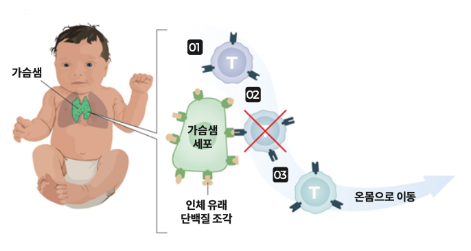02. 가슴샘에 있는 세포 중에는 표면에 인체에서 만들어진 단백질 조각을 품고 있는 세포도 있다. 가슴샘에서 만들어진 T세포 중 팀킬을 할 수 있는 T세포의 수용체는 이 단백질 조각과 결합한다.