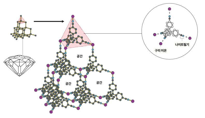 다이아몬드는 탄소(C) 단일 원소로 이뤄진 물질로, 다이아몬드를 구성하는 각 탄소 원자는 모든 인접 원자와 공유 결합을 하며 정사면체 구조가 반복해서 나타난다. 정사면체 구조 덕에 다이아몬드 내부에는 공간이 확보돼 있다. 롭슨 교수는 금속(구리 이온)과 유기물(나이트릴기)을 섞어 이 구조를 재현했다. 이는 최초의 MOF가 되며 현재의 MOF 발전의 서막이 됐다.