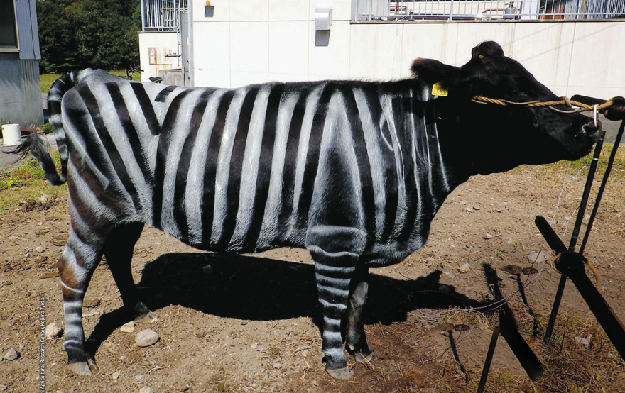 날벌레는 낙농가의 주된 골칫거리 중 하나입니다. 특히 말파리, 모기 등 흡혈 곤충은 소의 스트레스를 유발하고 염증을 일으킬 수 있습니다. 또 날벌레가 많이 들러붙을수록 소가 꼬리, 다리, 귀 등을 끊임없이 움직이며 에너지를 소모해 젖의 양이 줄어듭니다. 농가에서는 주로 살충제를 사용하지만 여기엔 내성 문제와 비용, 환경 오염이 뒤따르죠. 그런데 줄무늬 하나로 파리를 덜 꼬이게 할 수 있다는 연구 결과가 발표됐습니다. 일본 농업·식품산업기술종합연구기구(NARO)의 고지마 토모키 연구원은 얼룩말의 줄무늬가 흡혈 곤충을 막는다는 해외 논문을 읽고 ‘소에 얼룩말 무늬를 그려도 효과가 있을까?’라는 가설을 떠올렸습니다.