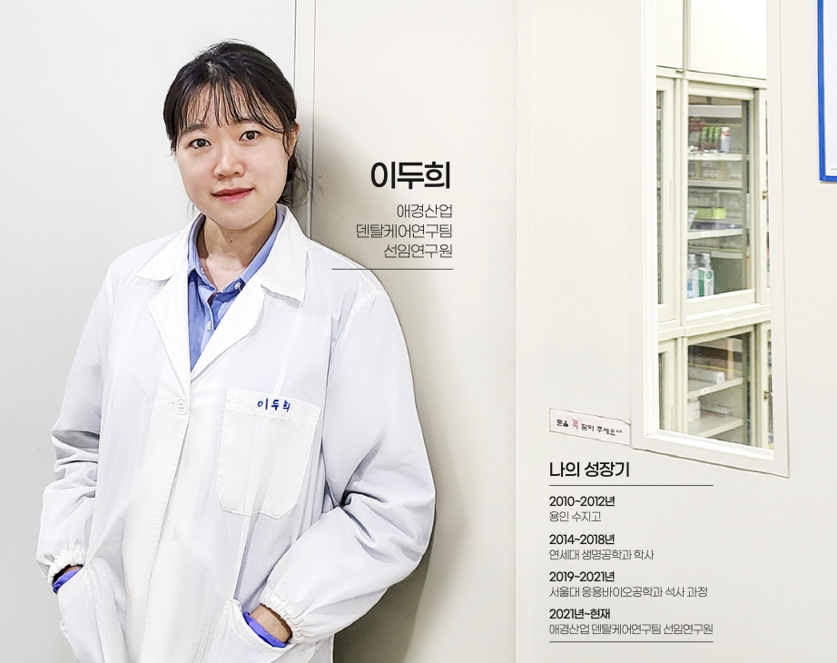 지금은 애경그룹에서 치약 제품의 연구 개발을 담당하고 있다. 연구의 주요 내용은 충치, 시린 이, 구취 같은 구강 질환의 발생 원인을 규명하고, 이를 개선하거나 예방할 수 있는 제품을 개발하는 것이다. 실험실에서의 연구를 토대로 소비자들의 일상생활을 직접 개선할 수 있는 결과물까지 생산한다는 점에서 큰 보람을 느낀다.