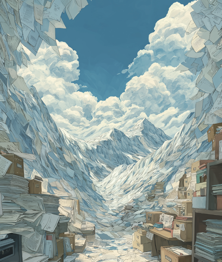 킴이 정신을 차리자, 어두운 공간이었다. 의식을 붙잡는 동안 눈이 서서히 어둠에 적응했다. 킴은 거대한 공간에 놓여 있었다. 아득히 멀리 떨어진 천장에서 빛이 군데군데로 떨어져 내렸다. 마치 자연적으로 형성된 커다란 동굴에서 암석 틈으로 햇살이 방울방울 떨어지듯. 그 아래로는 수많은 종이로 이루어진 산맥이 보였다. 킴은 재빨리 일어나 주변의 종이 더미를 파헤쳤다. 누군가의 신분이 적힌 서류가 있었다.