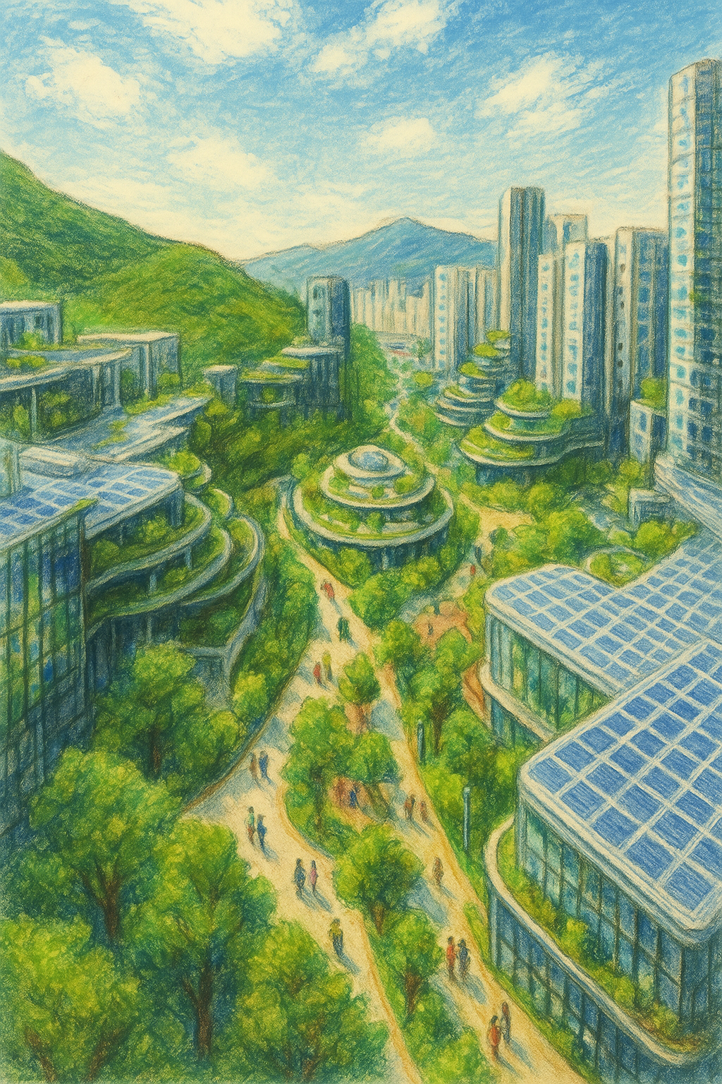 나는 아침을 먹으며 해수면 상승에 관한 기사를 보았다. 많은 사람들이 해수면 상승으로 인해 살던 곳을 떠났다는 내용이다. 요즘은 해양생물의 광합성과 해양식물을 이용하여 대기 중 이산화탄소를 흡수해 해수면 상승을 억제하는 기술이 발전되고 상용화되어 사용되고 있다. 그럼에도 해수면 상승 문제를 효과적으로 해결하기엔 부족했고 나 또한 몇 년전 내륙에있는 이 친환경 신도시로 이주했다. 이 친환경 신도시는 태양광 발전으로 전력공급을 하여 탄소배출을 줄이며 집집마다 에너지소비량을 모니터링 할 수 있는 장치가 있어 에너지 낭비를 줄이고 에너지를 효율적으로 사용할 수 있다. 또한 도시 내 모든 건물이 친환경 소재로 건축되어있다.[2]
