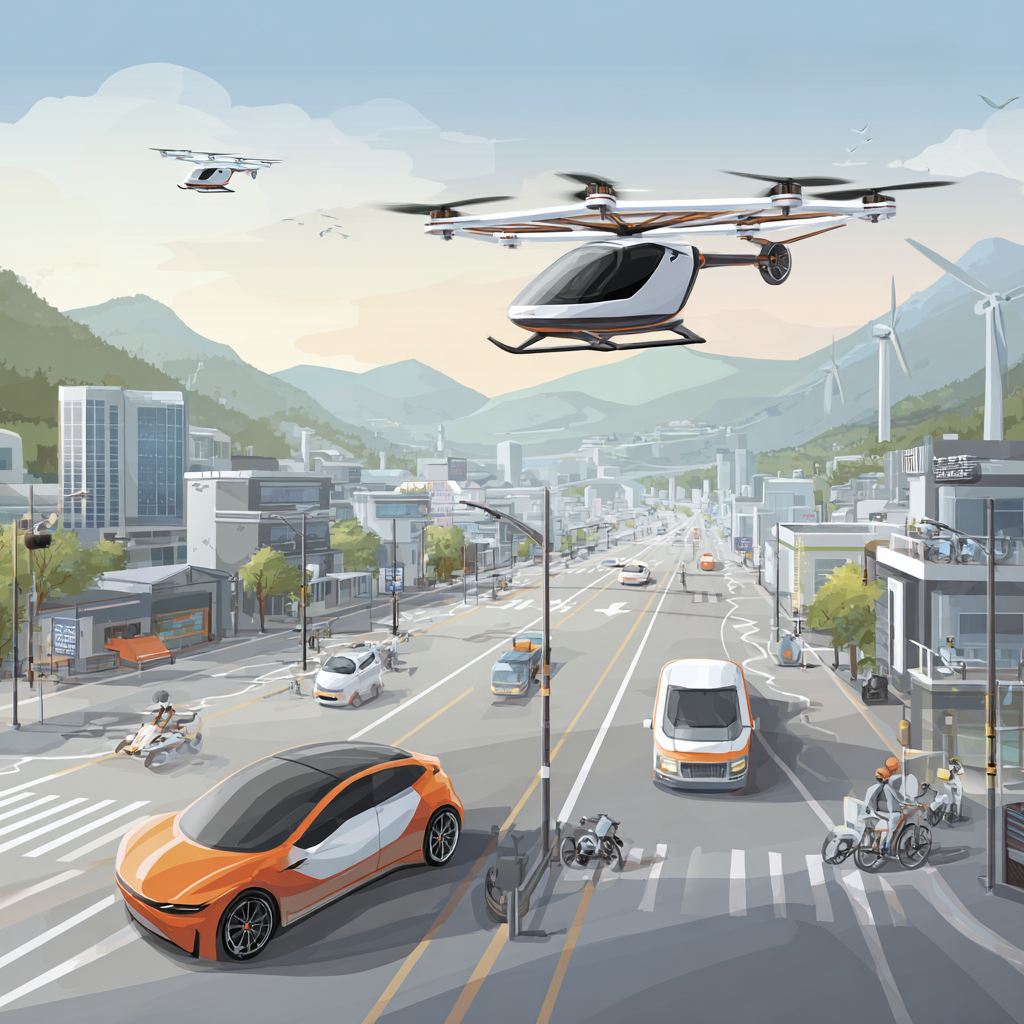 그리고 도시 곳곳에는 식물이 광합성을 하여 이산화 탄소를 흡수하고 산소를 배출하는 기술을 모방하여 만든, 인공적으로 이산화 탄소를 제거하는 장치가 설치되어 있다. 마지막으로 건물 외벽에 식물을 심어 온도와 에너지를 절감하고 공기질을 개선 하였다. 이런 친환경 신도시가 최근 곳곳에 개발되고 있다. 아침을 먹은 후 풍력발전을 통해 움직이는 드론 자동차를 타고 연구소로 출근했다. 이 드론 자동차는 자동차 양옆에 있는 터빈에서 인공적으로 바람을 만들어 풍력발전을 일으키고 그 힘으로 움직인다. 풍력 외에도 태양열 에너지, 바이오에너지 등을 이용한 자동차가 많이 개발되었다. 이제는 내가 타고 다니는 드론 자동차처럼 하늘을 나는 자동차가 대중화되었고 그에 따라 하늘에서의 교통체계도 마련되었다.[1]