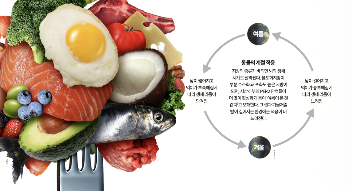 겨울이 깊어질수록 낮은 짧아지고 밤이 길어진다. 약 24시간 주기에 따라 생체 리듬을 조절하는 ‘생체 시계’는 이런 계절적 변화에 맞춰 몸의 리듬을 조절한다. 미국 캘리포니아대 카블리 기초 신경과학 연구소 연구팀은 섭취하는 지방의 종류가 계절에 따른 생체 시계 적응에 영향을 준다는 사실을 최초로 규명했다. 연구는 10월 23일 국제학술지 ‘사이언스’에 게재됐다. doi: 10.1126/science.adp3065
