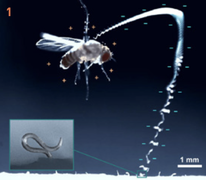 숙주 곤충이 지나가는 걸 감지하면 우리가 몸을 둥글게 말아 하늘로 뛰어오른다는 건 이전부터 알려져 있었어요. 하지만 공중에서 어떻게 숙주의 몸에 달라붙는지는 수수께끼였죠. 연구팀은 우리가 정전기를 이용할 거라 추측했어요. 초파리 같은 곤충의 날개는 파닥이며 대기와 마찰해 수백 V(볼트)의 양전하로 대전되거든요.