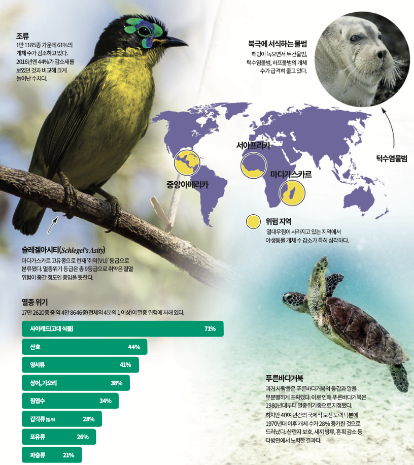 조류 개체 수가 앞선 예측보다 빠르게 줄고 있다. 북극에 서식하는 물범류는 멸종위기에 다가서고 있다. 그럼에도 푸른바다거북의 개체 수 회복은 야생동물 보전을 위한 노력이 효과가 있음을 보여줬다. 2025년 10월, 국제자연보전연맹(IUCN)이 발표한 보고서를 살펴봤다.