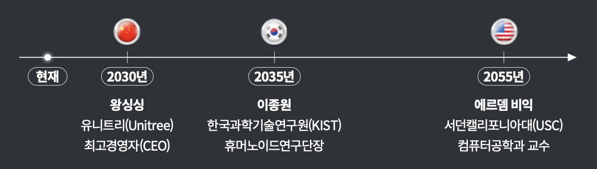 장밋빛 전망과 치열한 경쟁이 공존하는 현재가 휴머노이드 산업의 ‘티핑 포인트’라면, 휴머노이드가 집집마다 들어와 가사노동을 하는 ‘특이점’은 언제쯤 올까. 기자가 만난 세계 각지 연구자들은 다양한 수치를 내놨다. ‘짧으면 5년, 길면 30~40년.’ 당장 몇 년 안에 급격한 변화가 있진 않겠지만, 이들은 대부분 특이점의 시기를 ‘한 세대’ 안으로 점쳤다.