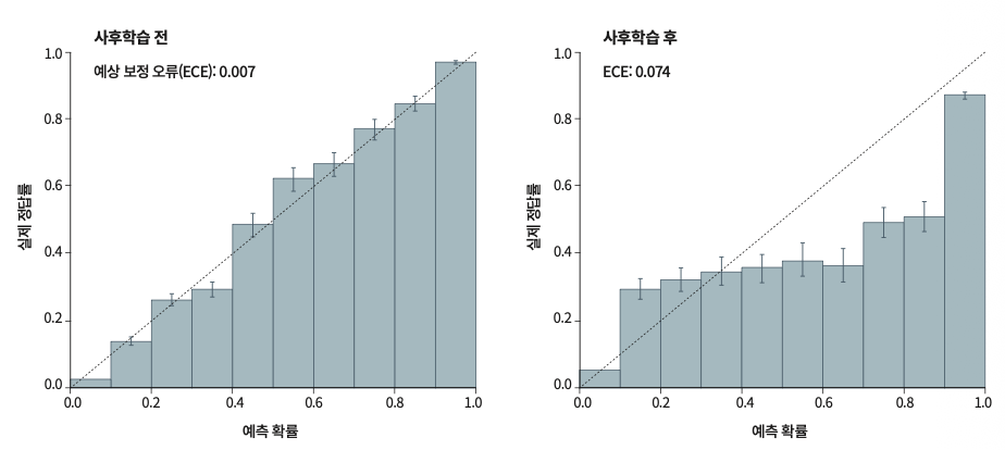 아래 그래프 중 사전학습만 진행한 사후학습 전의 GPT-4는 예측 확률과 실제 정답률의 차이가 0.007에 불과해 잘 보정된 상태인 반면, 사후학습 후엔 이 차이가 0.074로 10배 이상 증가했다. 이는 사후학습을 진행한 GPT-4가, 결과가 불확실한 상황에서도 자신의 예측을 과도하게 확신했음을 의미한다.
