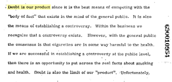 담배 회사들은 담배 산업에 대한 공격을 무마하기 위해 다양한 기초 과학 연구에 막대한 연구 자금을 지원했다. 담배와 암 사이의 연관성을 직접적으로 부정하는 연구는 물론, 담배 말고 암의 다른 원인을 밝히는 연구 등 대중과 언론의 시선을 담배로부터 돌리려 노력했다. 그런 다음, 담배 업계는 담배의 유해성에 대한 ‘과학적 논쟁’이 있다고 주장했다. 그리고 책임 있는 언론이라면 논쟁의 양쪽 입장을 모두 소개할 의무가 있다고 설득했다. 마치 담배의 유해성에 대해서 서로 다른 동등한 주장들이 있는 양 대중을 오도한 것이다. 담배 회사의 어느 중역이 1969년에 작성한 메모에는 다음과 같이 적혀 있었다. “의심이 우리의 상품이다”