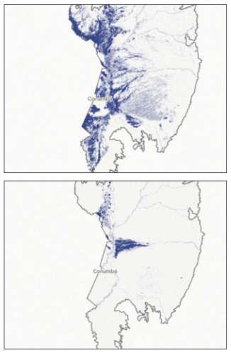 아마존 바로 아래 있는 판타나우 습지의 1985년 물의 분포(위)와 2024년 가뭄이 일어났을 때 물의 분포(아래).
