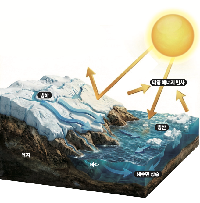 북극 해빙은 태양광을 반사한다. 지구가 뜨거워져 북극 해빙이 녹으면, 해빙으로 덮여있지 않은 어두운 바다가 햇빛을 더 많이 흡수한다. 북극은 뜨거워지고 해빙도 빨리 녹는다. 그러면 바로 아래 있는 그린란드 빙상이 녹는 속도도 덩달아 빨라진다. 그린란드 빙상이 녹아 생긴 담수는 대서양으로 흘러가 대서양 해류를 방해한다. 이렇게 대서양 해류가 북쪽으로 열을 나르지 못하면서 유럽에 한파가 찾아오고, 남반구는 더 뜨거워진다. 9곳이 상호작용해 환경이 급격히 변하다가 티핑 포인트를 넘어서면, 지구는 생명체가 살기 힘든 행성이 되고 만다.