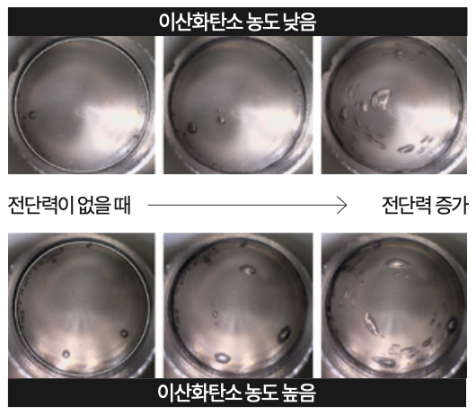 연구팀은 전단력을 만들기 위해 두 금속판 사이에 PEO를 얇게 채운 뒤, 아래 금속판을 좌우로 진동시켰다. 금속판의 진동 속도가 높아질수록 전단력이 커졌고, 특정 지점에서 기포가 생겼다. 연구팀은 이 지점을 ‘임계 전단력’이라고 정의했다. 이산화탄소를 PEO에 많이 녹일수록 임계 전단력이 낮아졌다. 이산화탄소 농도가 높으면 전단력을 조금만 가해도 기포가 잘 생기는 것이다.