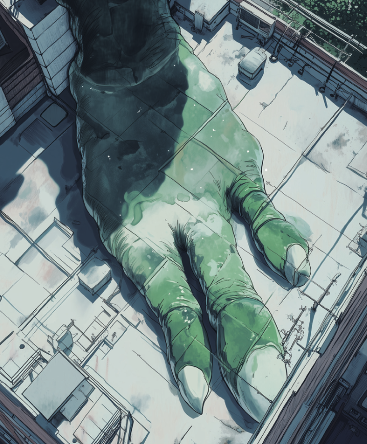 “머리 숙여!” 누군가 말했고, 피아노를 옮기던 사람들도 짐을 내려놓고 몸을 낮추었다. 발밑에서 무언가 다시 한 번 꿈틀했다. 거대한 머리에서 눈을 떼지 못했지만, 모아의 시야 끝에 발과 바닥이 간신히 들어왔다. 모아가 밟은 것은 또 하나의 앞발이다. 세 개의 둥근 발톱이 달려 있고, 완전히 투명해서 초록색 옥상이 환히 내려다보이는, 앞발.