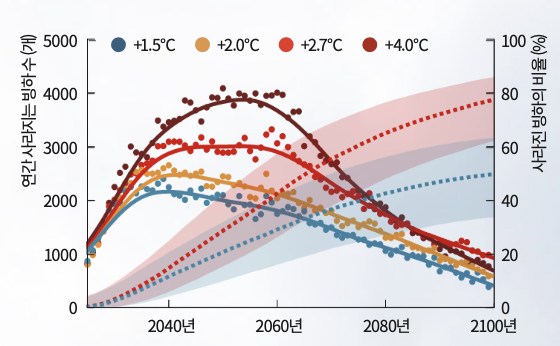 분석 결과, 21세기 말에 지구 온도가 1.5°C만큼 상승하면 연간 사라지는 빙하의 수는 2041년에 정점을 찍었다. 해당 시기엔 한 해에 2000개의 빙하가 사라졌다. 또 4℃만큼 상승하면 2050년대에 정점을 찍어 한 해에 4000개의 빙하가 사라졌다. 연구팀은 연간 사라지는 빙하 수가 정점을 찍는 시점을 ‘빙하 소멸 정점’으로 정의했다. 빙하 소멸 정점을 지나도 빙하는 계속 사라진다.