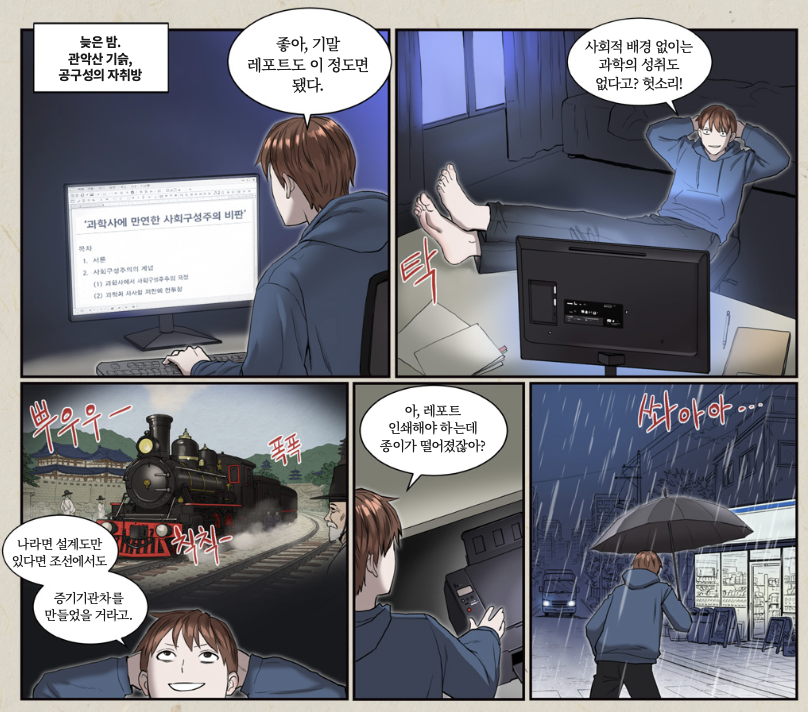 30분 전 서울 관악산 기슭. 구성이 사는 옥탑방의 공기는 커피 향과 먼지, 그리고 지독한 오만함으로 가득 차 있었다. 한국대 과학학과에서 서양과학사를 전공하는 석사과정생 구성은 학기말 과제의 마지막 문장을 타이핑하고는 의자 깊숙이 몸을 묻었다. 모니터의 워드 프로세서에는 다음과 같은 제목이 적혀 있었다. ‘과학사에 만연한 사회구성주의 비판: 과학의 보편성과 기술결정론을 옹호하며’.