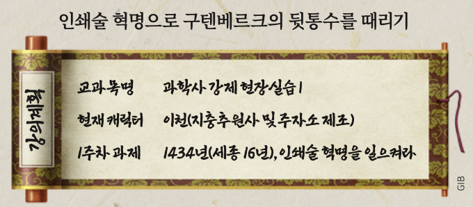 “전하! 조선의 인쇄 방식은 비효율적입니다. 앞으로 열 달 안에 현재의 인쇄술을 바꿀 구텐베르… 아니, ‘누름틀’을 제작하겠나이다.”