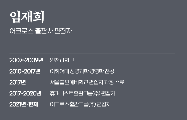 저는 과학이라는 학문 속에서, 과학을 수행하지는 않는 직업을 갖고 있습니다. 출판사에서 과학책을 만드는 편집자로서 과학의 지식과 이야기를 독자들에게 더 잘 전달하는 중간 다리를 놓는 일들을 합니다.