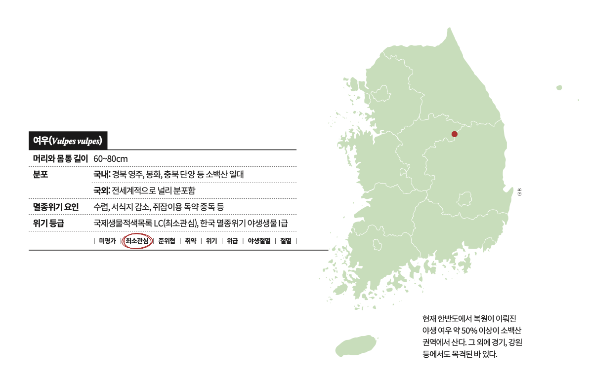 그러나 뚜렷한 ‘이미지’를 가지고 있다는 건 거꾸로 여우가 그만큼 사람과 가까이 살아가던 생물이란 뜻도 된다. 오죽하면 여우가 둔갑해 사람과 함께 살아간다는 이야기를 했을까. 20세기 이전 한반도에서 여우는 산과 들, 그리고 사람이 살아가는 마을 근처에서 어렵지 않게 볼 수 있는 동물이었다. 그러다 20세기 들어 모피용 사냥과 1970년대 벌어진 쥐잡기 운동의 결과로 여우의 개체수가 크게 줄었다. 쥐를 잡으려고 쓴 약이, 쥐를 먹은 여우도 함께 죽인 것이다. 그 결과 20세기 말에는 한반도에서 여우를 찾아볼 수 없게 됐다. 현재 환경부는 여우를 멸종위기야생생물 I급으로 지정해 보호하고 있다.