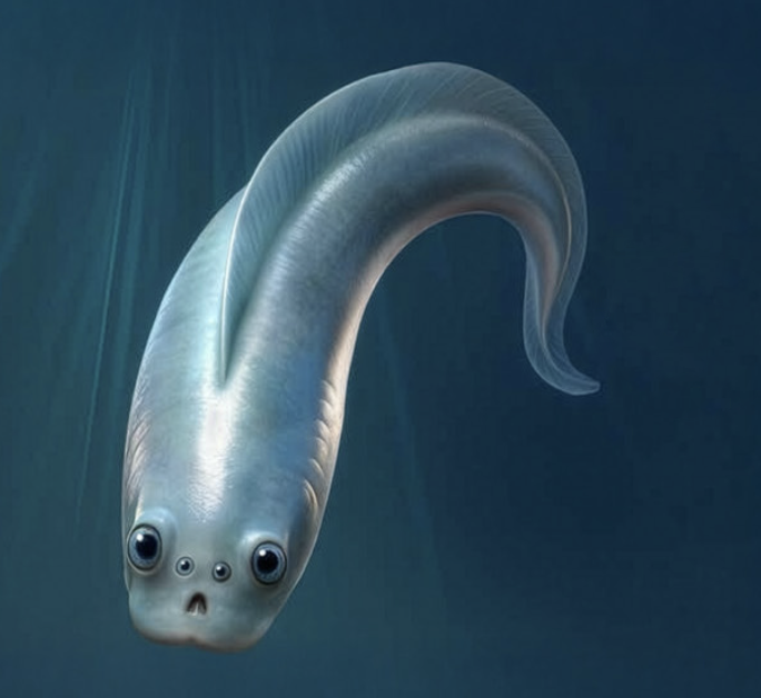 제가 살았던 캄브리아기의 바다는 지금보다 훨씬 위험한 곳이었습니다. ‘캄브리아기 대폭발’로 생물 다양성이 급증하면서 거대 포식자들이 진화해 사냥감을 찾아다녔습니다. 살아남으려면 360° 전방위 감시가 필수였던 거죠. 저희 같은 밀로쿤밍기드 화석들은 무리 지어 발견됩니다. 집단 생활을 했다는 증거입니다. 물고기 떼가 포식자를 피하려면 전후좌우뿐만 아니라 위에서 오는 위협도 감지해야 합니다. 머리 위쪽의 송과체 눈이 바로 그 역할을 했습니다. 잠수함의 잠망경처럼 위쪽을 감시하는 눈이었던 셈이에요.