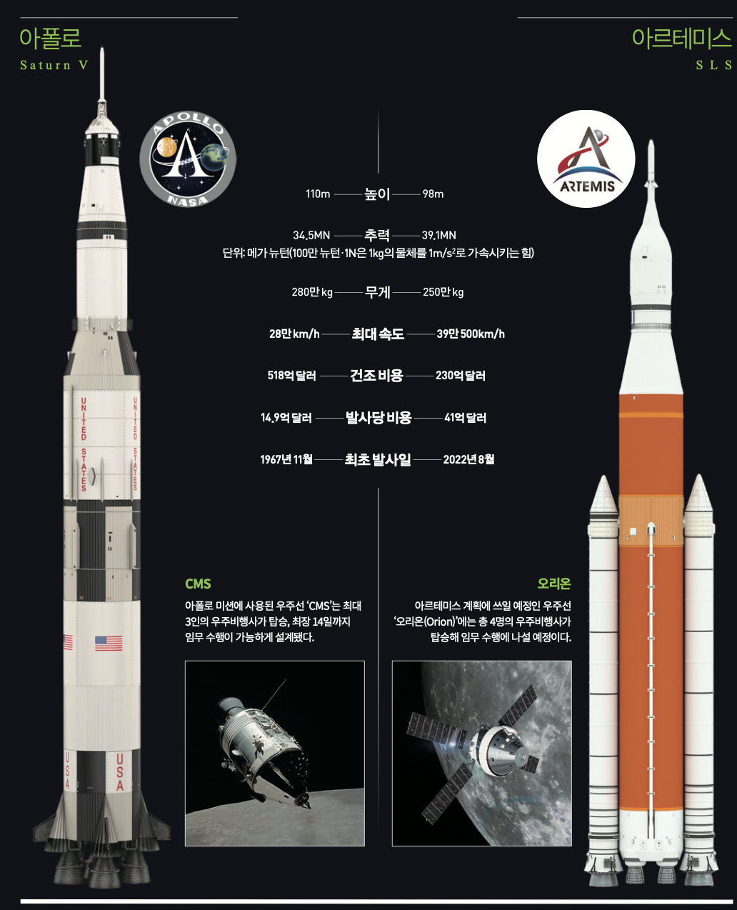 아르테미스 계획에 사용되는 로켓 ‘SLS’은 아폴로 계획의 ‘새턴 5’에 비해 추력, 최대 속도 등에서 발전했다. 다만 발사 비용이 급격히 증가해 일회성 로켓인 SLS의 지속가능성에 대한 의문도 제기된다. 두 로켓의 스펙을 비교했다.