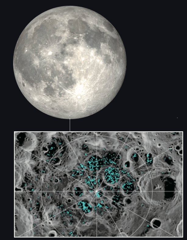 NASA는 달 궤도 위성을 통해 달 지도 제작과 정교화를 진행 중이다. 표시된 부분은 달 남극에서 물과 얼음이 있을 것으로 예상되는 지역. 푸를수록 물 신호가 더 많이 나타남을 뜻한다.