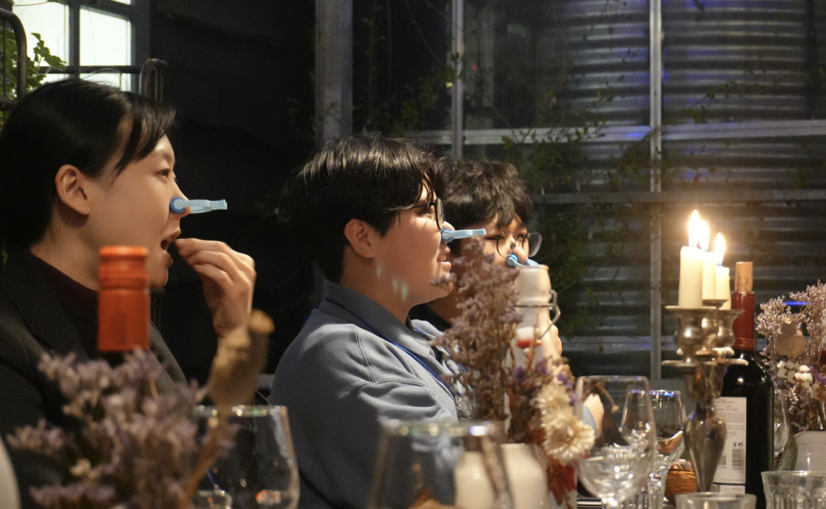 2월 6일 저녁, 워튼 키친 가든에서 삼양라운드스퀘어 프라이즈 대상 수상자들이 스펜스 교수와 식사를 했다. 코를 막고 젤리를 먹는 실험 중인 모습.