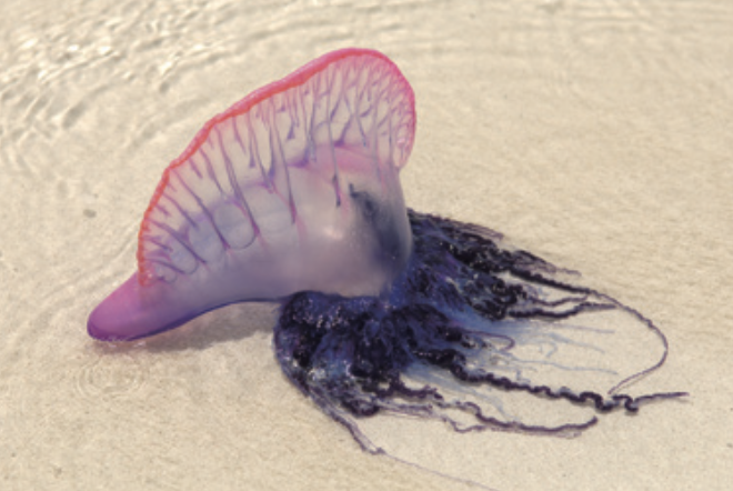 삼각형 모양의 공기주머니 덕분에 수면 위를 둥둥 떠 다니는 해파리다. 해변에 떠밀려온 비닐봉지 등 플라스틱 쓰레기와 혼동되는 경우가 많은데, 맹독성이라 주의가 필요하다.