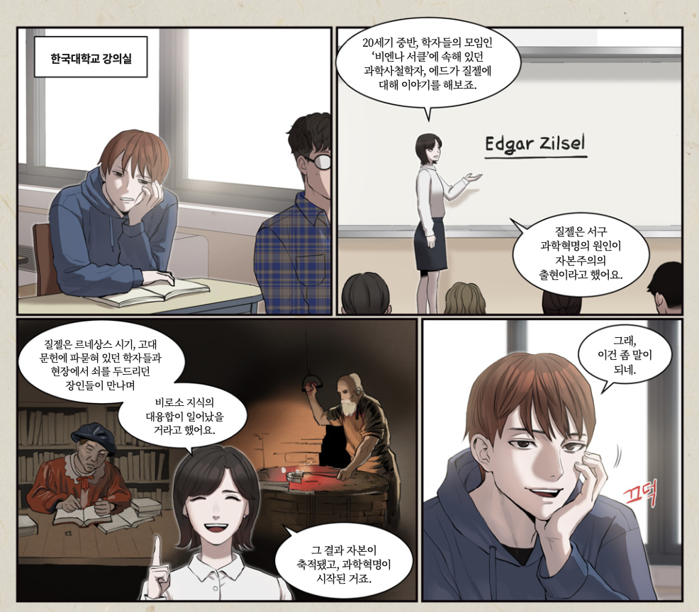 20세기 초중반 활약한 과학사철학자 에드가 질젤은 근대 초기 서양에서는 ‘학자’와 ‘우수한 장인’이 접촉해 이론과 현장의 지식이 대융합을 이뤘다고 주장했다. 학자들이 전통적인 학문의 권위를 벗고 장인과 마찬가지로 관찰을 중시했고, 장인의 경험적 규칙을 보편적 물리 법칙으로 진화시키면서 과학 혁명이 이뤄졌다는 것이다. 구성은 이 이론이 퍽 마음에 들었다. 구성에게 질젤의 이론은 하드웨어(장인)와 소프트웨어(학자)를 한 메인보드에 꽂아야 시스템이 돌아간다는 공학적 매뉴얼처럼 보였다. “그래, 이건 좀 말이 되네. 과학의 사회적 구성론이 아니라 시스템 설계잖아.” 구성이 보기에 이 ‘공학적 매뉴얼’의 가장 완벽한 예시가 아그리콜라의 ‘금속에 관하여’였다. 비록 과학혁명기 이전에 나오기는 했지만.