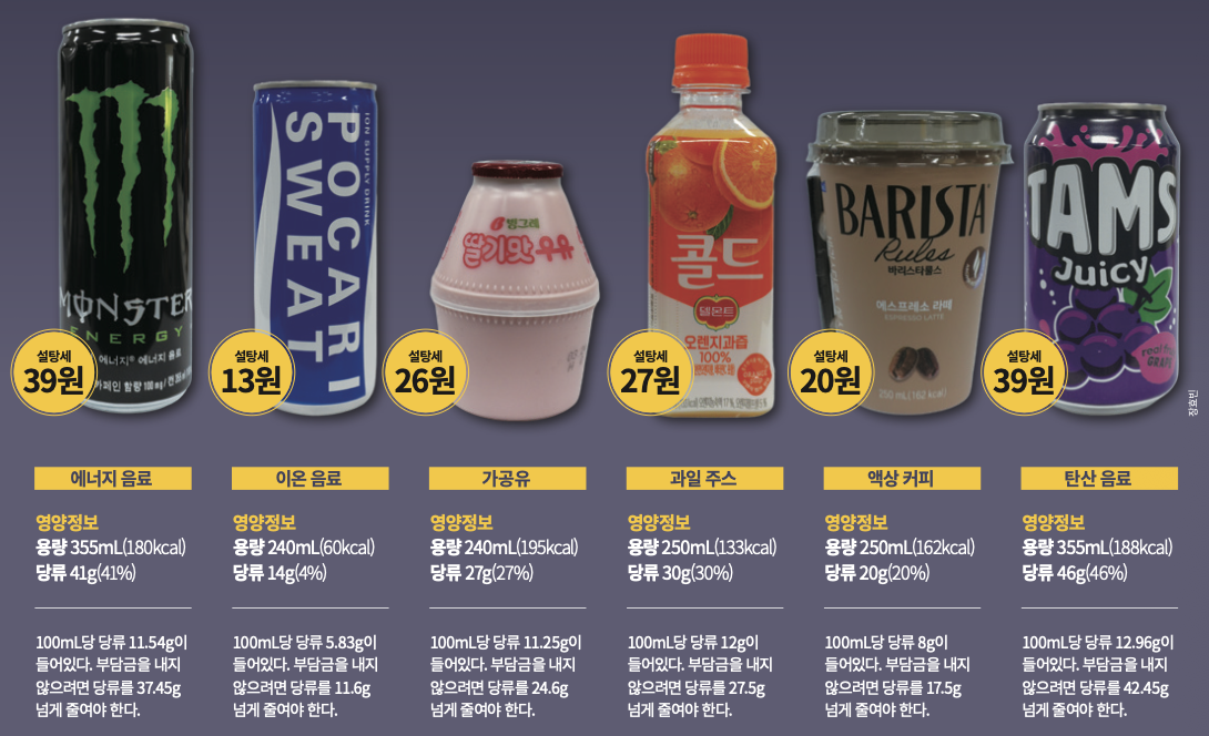 편의점에 가면 살 수 있는 탄산 음료(2000원), 초코 우유(1200원), 액상 커피(1500원). 이 음료들의 가격 인상을 우려하는 목소리가 나오기 시작했다. 1월 30일에 김선민 조국혁신당 의원을 포함한 국회의원 11명이, 2월 3일에는 이수진 더불어민주당 의원을 포함한 국회의원 10명이 ‘설탕부담금’을 시행하자는 내용을 담은 국민건강증진법 개정안을 발의했기 때문이다.